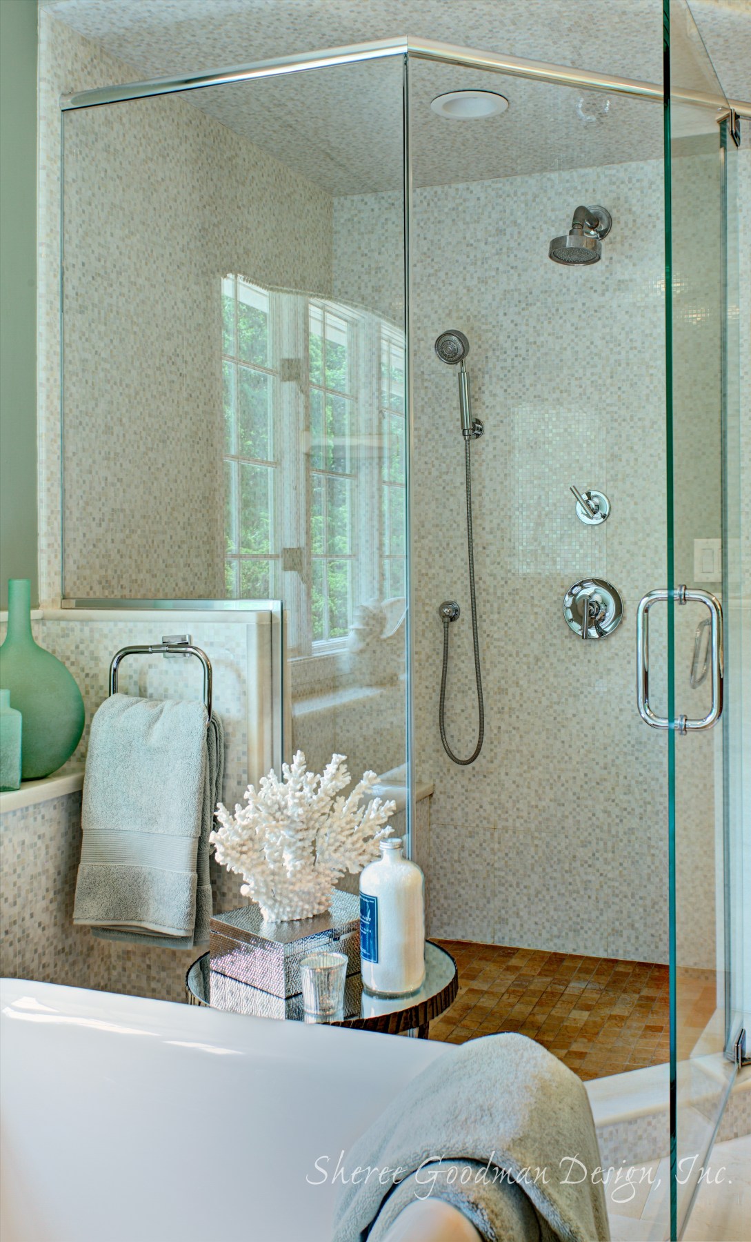 TO CREATE THE fresh and modern feeling you would expect at a luxury resort, we drew inspiration from the tranquil elements of the beach and ocean. Soft, sea-foam walls and a freestanding sculptural soaker tub against a visually interesting mosaic half-wall make a stunning focal point.