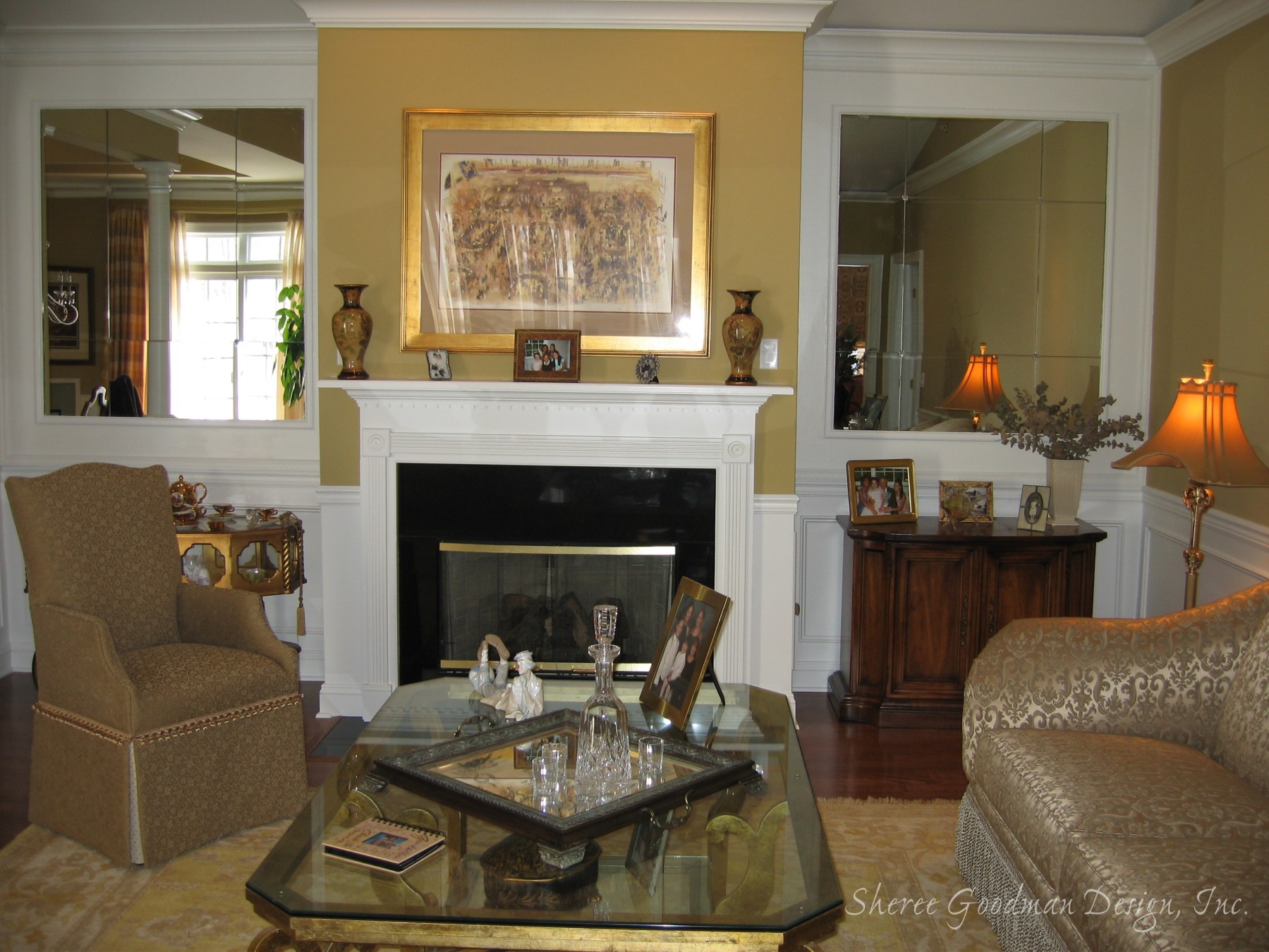 TO GIVE THE two new sofas a cost-friendly customization, we found an inexpensive, durable, poly-blend fabric to reupholster them with. The walls were given some added detail and interest with the installation of moldings while mirrors work to expand the space.
