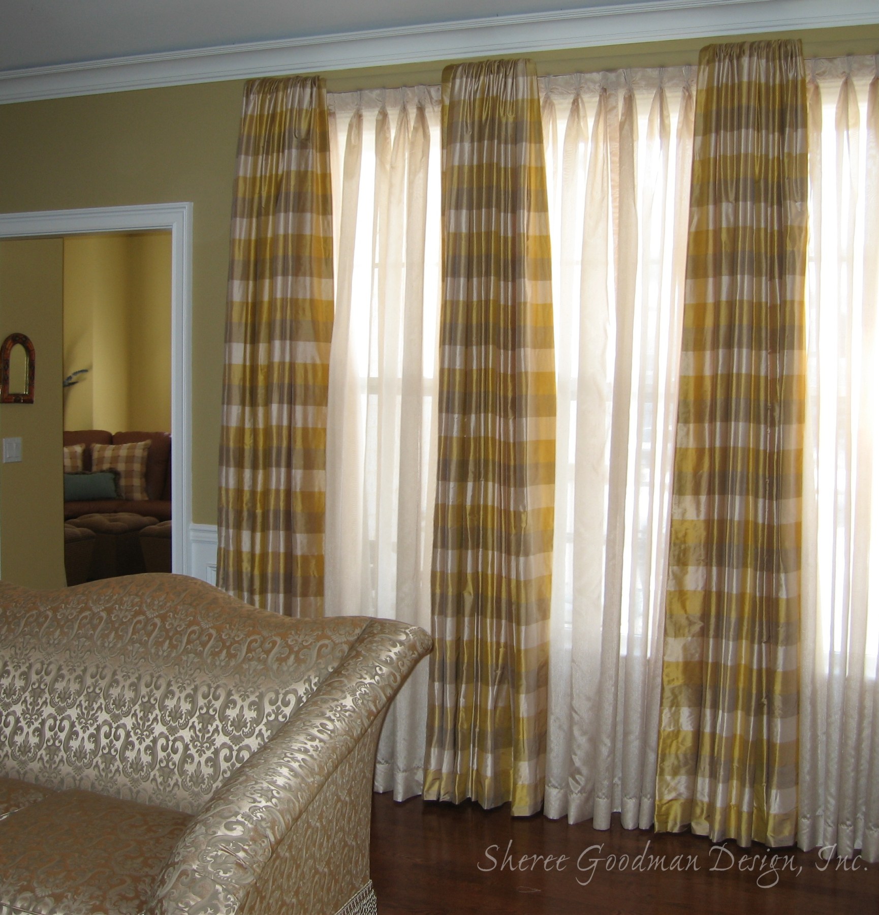 The sheers beneath the freshly striped curtains illuminate the sunshine bringing out the luster in the upholstery of the sofa.